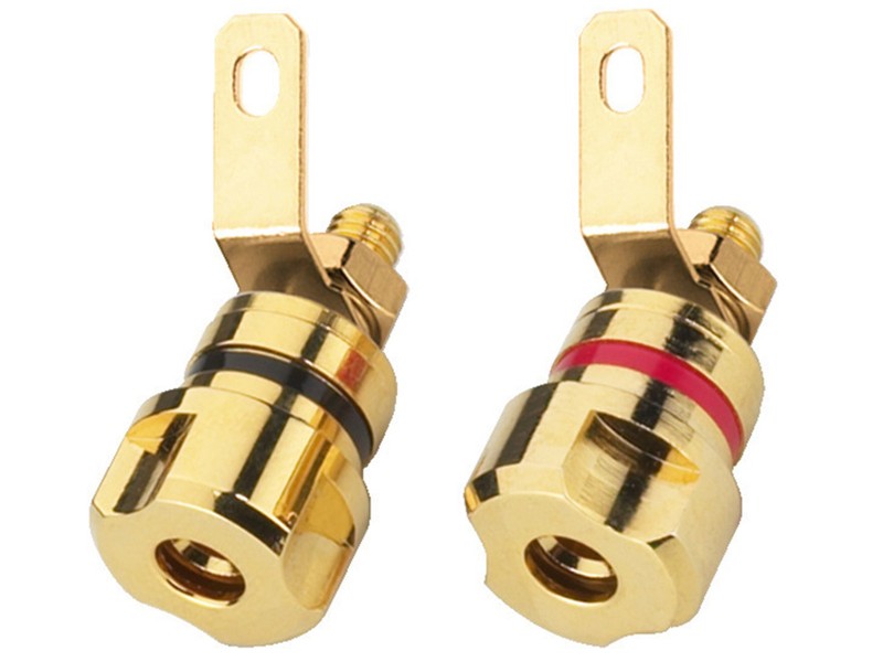 Терминалы для акустических систем Monacor BP-405G от немецкого концерна Monacor International GmbH изготовлены из чистой латуни с золотым наружным покрытием и красной/черной маркировкой на корпусе. Для подсоединения к терминалам можно использовать как оголенный кабель, так и разъемы типа "лопатка" или "банан".