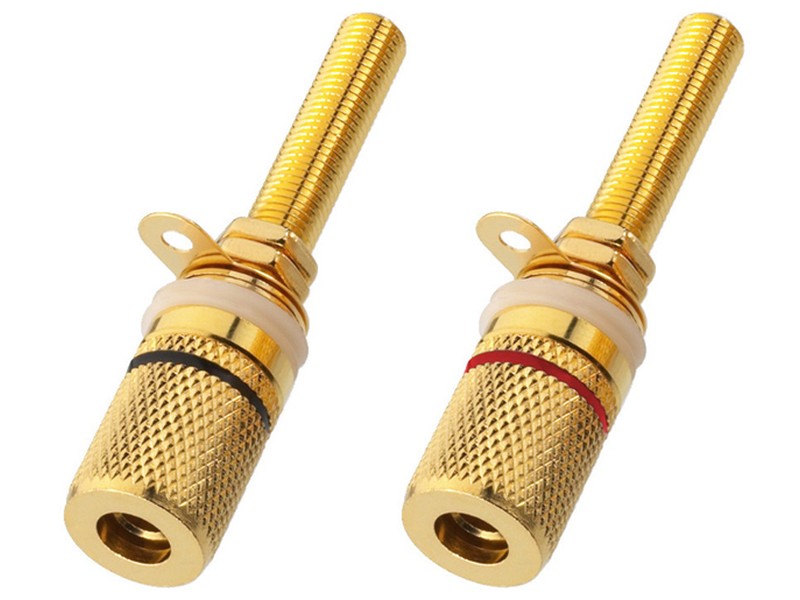 Терминалы для акустических систем Monacor BP-500G от немецкого концерна Monacor International GmbH изготовлены из чистой латуни с золотым наружным покрытием и красной/черной маркировкой на корпусе. Для подсоединения к терминалам можно использовать как оголенный кабель, так и разъемы типа "лопатка" или "банан".