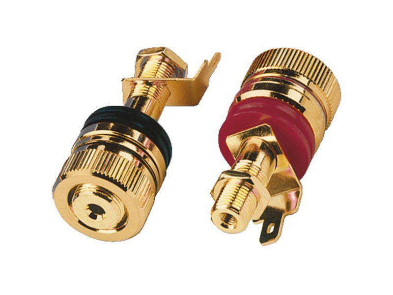 Терминалы для акустических систем Hi-End класса Monacor BP-520G от немецкого концерна Monacor International GmbH изготовлены из чистой латуни с золотым наружным покрытием и красной/черной маркировкой на корпусе. Для подсоединения к терминалам можно использовать как оголенный кабель, так и разъемы типа "банан". Подключение разъёмов типа "лопатка" крайне затруднено или невозможно ввиду очень большого диаметра барашка терминала.
