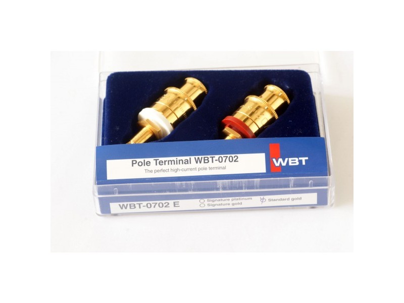 Комплект акустических терминалов WBT-0702.11 KIT, выполненных из специального сплава с высоким содержанием меди, покрытого слоем 24К золота (0,3 мкм) и тщательно отполированного вручную. В качестве материала изоляции используется полиамид, армированный стекловолокном (10%), и поликарбонат с добавлением стекловолокна (30%).