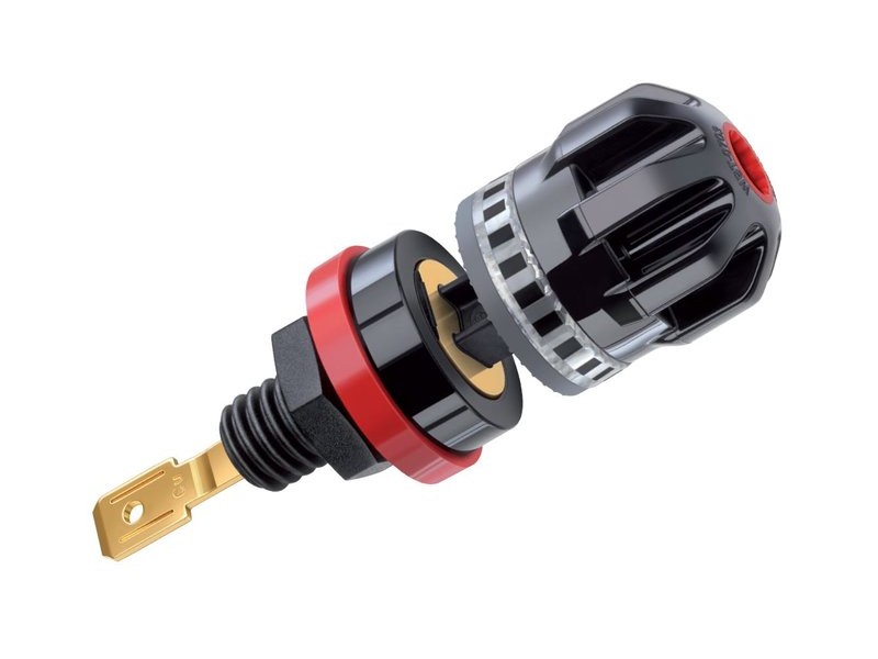 Акустические терминалы WBT-0703 Cu с контактами, выполненными из чистой меди с 24К позолоченным покрытием без содержания никеля, и корпусом из полиамида, поликарбоната и термопластичного эластомера, соответствующего стандартам СЕ и IEC. Имеют красную/белую маркировку для удобной идентификации каналов.