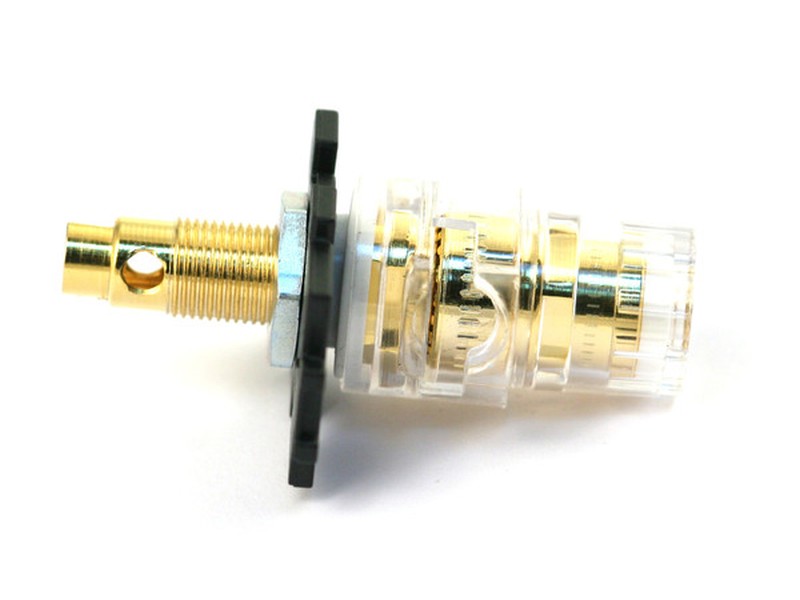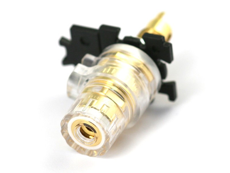 Акустические терминалы WBT-0765 выполнены из специального сплава с высоким содержанием меди (52%), покрытой 24К позолотой, и защищены внешней оболочкой из запатентованного прозрачного пластика Makrolon®, соответствующего стандартам СЕ и IEC. В качестве материала изоляции используется полиамид, армированный стекловолокном (10%) и поликарбонат с добавлением стекловолокна (30%). Имеют цветную маркировку для удобной идентификации каналов.