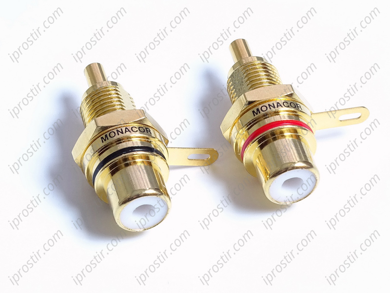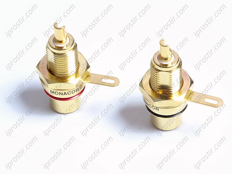 Аппаратные гнезда RCA Monacor T-710GI с фторопластовой втулкой-изолятором и красной/черной маркировк..