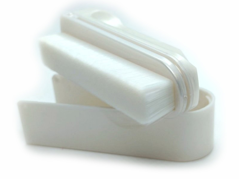 Ця щітка — витончена у своїй простоті: корпус із строгими формами, білий контраст із мікроволокнами сілону, кожне з яких має діаметр лише 0,01 мм. У руці вона легка, але діє потужно: руків'я довге, щоб охопити весь діаметр диску, а щітка — така делікатна, що підходить для вологого очищення з рідиною або сухого проходження по канавці.