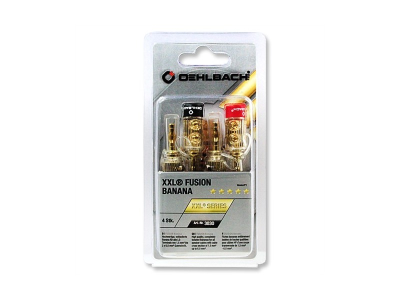Акустические бананы Hi-End класса Oehlbach XXL Fusion Banana имеют продуманную конструкцию и обеспечивают быстрое и надёжное подключение акустических систем. Контакты бананов покрыты 24К позолотой, красная и черная маркировка на корпусе служит для удобной идентификации каналов. Крепление кабеля осуществляется при помощи двух винтов, благодаря чему обеспечивается 100% контакт проводника с разъёмом и высокое качество передачи сигнала.