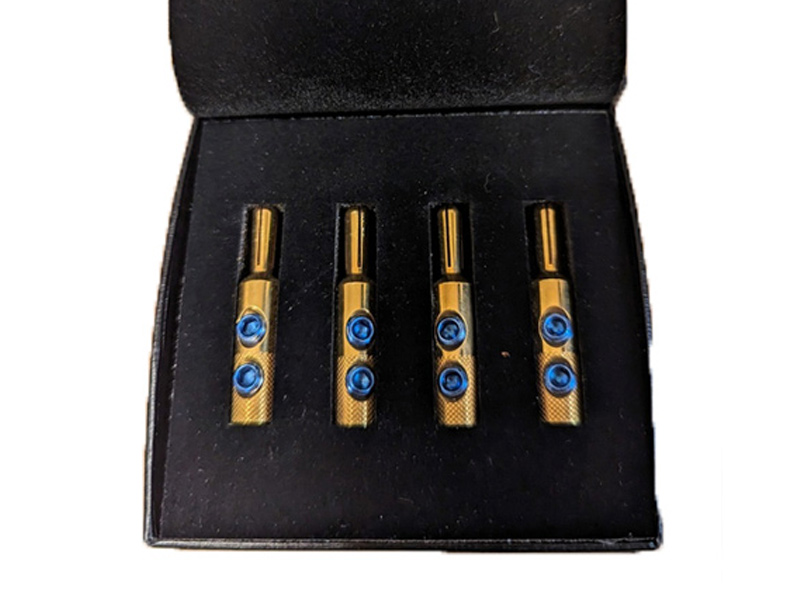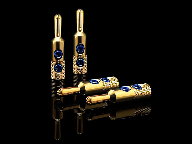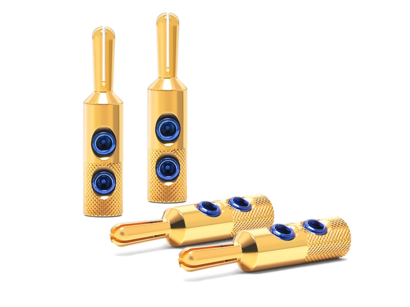 Комплект акустичних бананів із покриттям сріблом та 24К золотом. Максимальний діаметр кабелю: до 4 мм