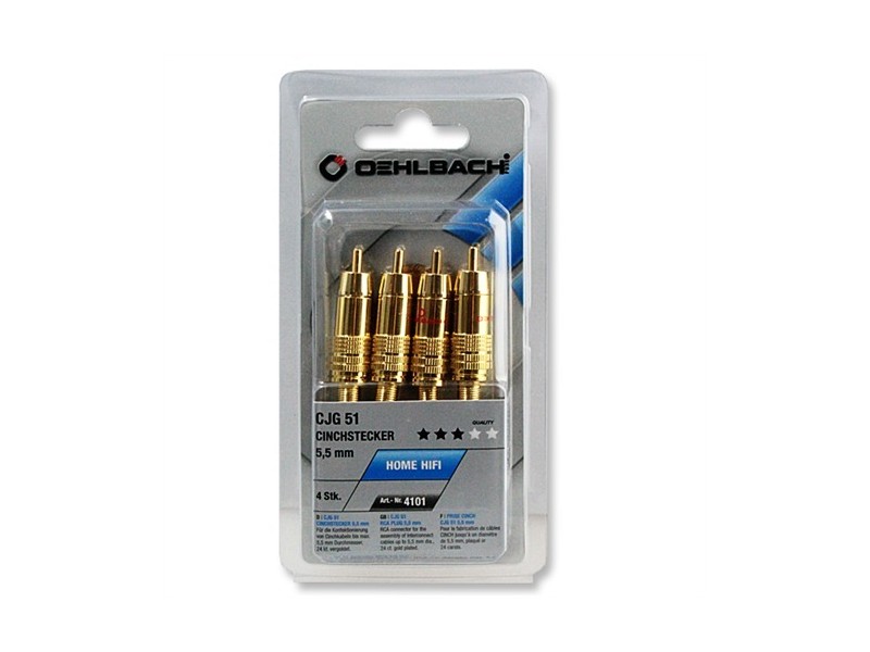 Цельнометаллические разъемы RCA Oehlbach CJG 51 GO с волновым сопротивлением 75 Ом используются для качественной передачи цифровых сигналов S/PDIF. Контакты разъёмов покрыты 24К позолотой, красная и белая маркировка на корпусе служат для удобной идентификации каналов. Для предотвращения излома кабеля на конце разъема имеется предохранительная пружина. Установка проводника в разъеме производится с помощью пайки.