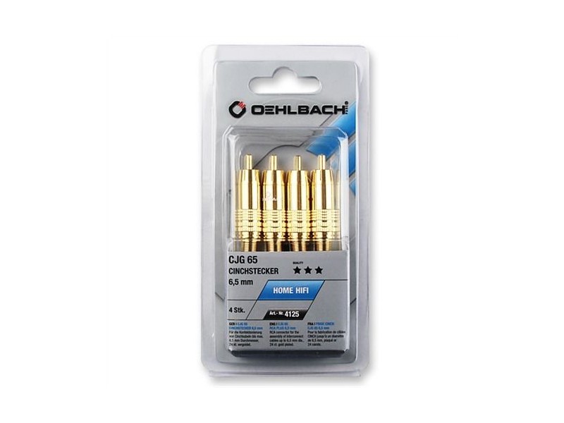 Цельнометаллические разъемы RCA Oehlbach CJG 65 с волновым сопротивлением 75 Ом используются для качественной передачи аудио-видеосигналов и цифровых сигналов в интерфейсе формата S/PDIF. Контакты разъёмов покрыты 24К позолотой, красная и белая маркировка на корпусе служат для удобной идентификации каналов. Для предотвращения излома кабеля на конце разъема имеется предохранительная пружина. Установка провода в разъеме производится с помощью пайки.