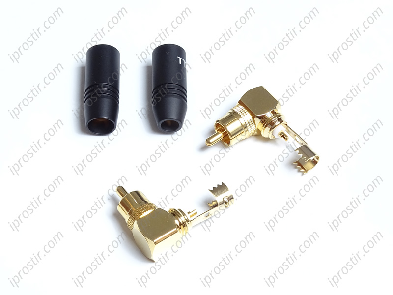 Угловые разъемы RCA с 24К позолоченным покрытием. Диаметр кабеля: до 6,5 мм.