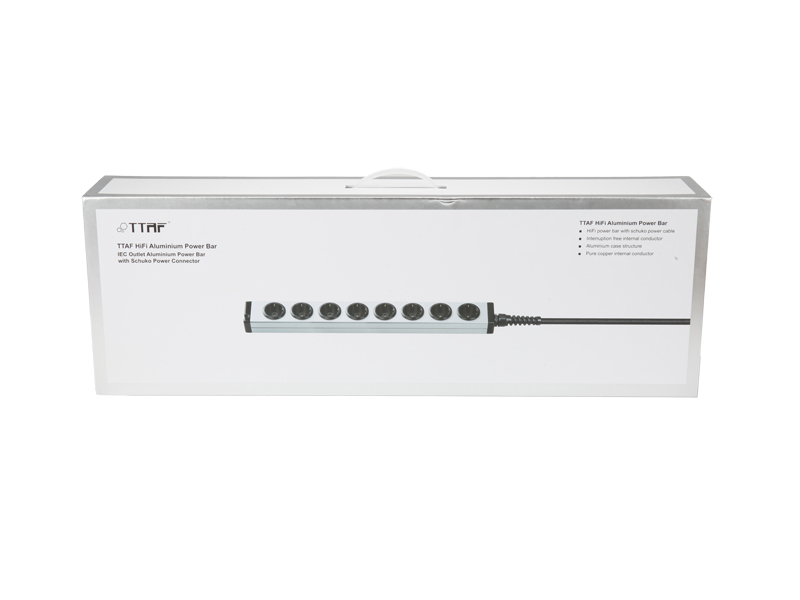 Hi-End дистрибьютор TTAF Power Bar 6 Gold Line с шестью качественными розетками в алюминиевом корпусе с медными контактными группами. TTAF Gold Line комплектуется сетевым кабелем TTAF 93269 сечением 3х2,5 мм² длиной 2,0 метра, заведенным непосредственно в корпус дистрибьютора без аппаратного разъема, и алюминиевым сетевым коннектором TTAF 93299 с родиевым покрытием.