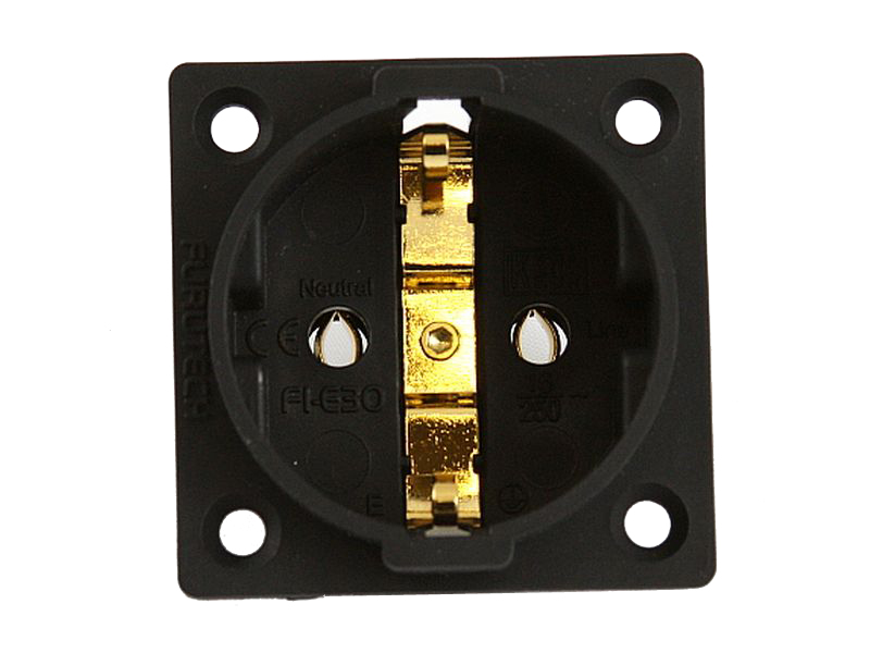Сетевая (силовая) монтажная розетка европейского стандарта Furutech FI-E30 служит для подключения силового кабеля, надёжного контакта и минимального уровня помех. Все контакты розетки выполнены из эвтектического медного сплава, обработанного по фирменной Alpha-технологии Furutech (двойная криогенная обработка с размагничиванием), и покрыты позолотой. Корпус из нейлона, усиленного стекловолокном, обеспечивает механическую жёсткость, термостабильность, электрическую изоляцию и погашение нежелательных резонансов конструкции.