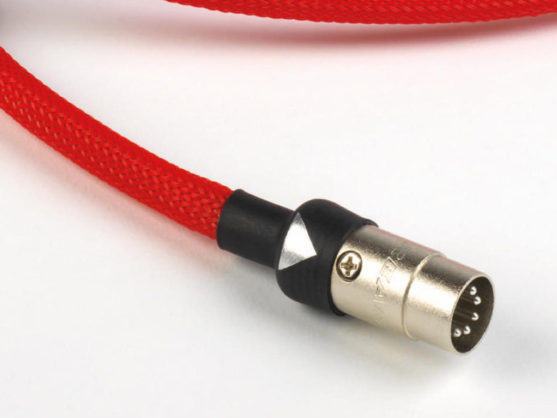 Кабель с разъемами 5 pin DIN выполнен на основе качественного межблочного кабеля Shawline компании The Chord Company (Великобритания). Проводники изготовлены из многожильной бескислородной посеребренной меди. В качестве диэлектрика использован полимер FEP, схожий во многом с тефлоном, но отличающийся большей мягкостью. Композитный экранирующий материал минимизирует внешние шумы и помехи в широком диапазоне частот. Для дополнительной защиты от механических шумов, а также обеспечения гибкости, прочности, износостойкости кабеля применена полихлорвиниловая внешняя оболочка и плотная оплетка красного цвета.