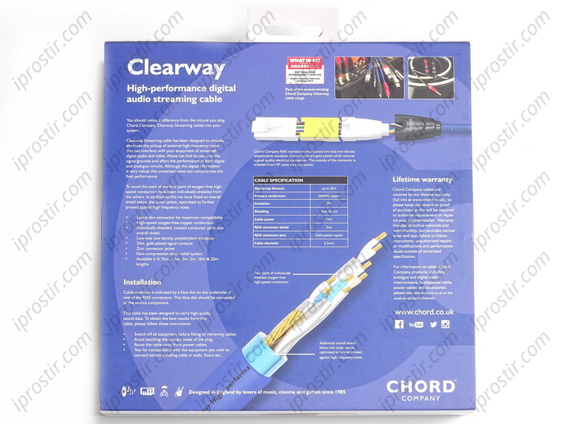 LAN кабель CHORD Clearway Digital Streaming оборудован новыми цинковыми разъемами для максимальной совместимости и улучшенного экранирования, сигнальные контакты позолочены. Кабель поставляется в фирменной коробке The Chord Company.