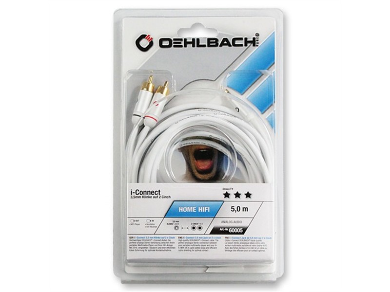 Oehlbach i-Connect — кабель-переходник с разъёмом mini-jack 3.5 mm на одном конце кабеля и двумя разъёмами RCA на другом. В качестве материала проводников используется очищенная бескислородная медь OFC. Внешняя оболочка кабеля обладает высокой гибкостью, прочностью и защищает проводники от механических повреждений и воздействия окружающей среды. Цельнометаллические разъемы, покрытые 24К позолотой, обеспечивают надёжный контакт и длительный срок эксплуатации.