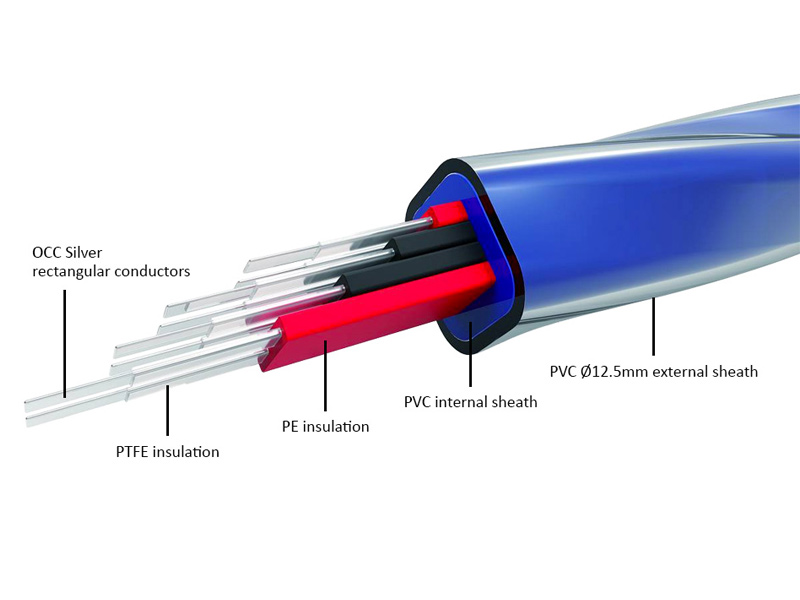 Высококлассный акустический кабель Neotech NEMOS-1080 отличается универсальной конструкцией, включающей наилучшие компоненты для максимальной проводимости и оптимальной передачи сигнала, что обеспечивает высокое качество воспроизведения звука. Кабель включает в себя прямоугольные проводники из монокристаллического серебра Ойно высокой чистоты площадью 2,1 мм² (14AWG) с индивидуальной изоляцией из тефлона. Каждая пара проводников имеет дополнительную общую полиэтиленовую изоляцию. Пары проводников располагаются послойно и затем покрыты внутренней оболочкой из поливинилхлорида. Внешняя изоляция также изготовлена из поливинилхлорида синего цвета и поверх прозрачный слой.