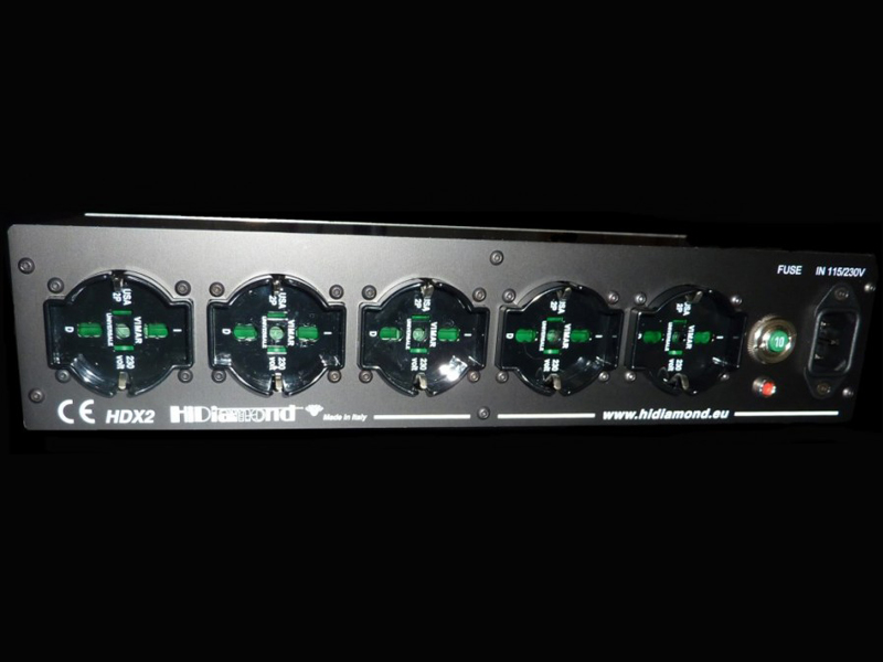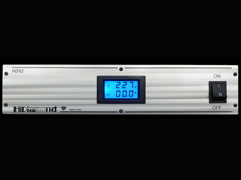 HiDiamond HDX2 – топовая модель в линейке сетевых дистрибьюторов производителя, представляющая собой мощную силовую станцию для распределения, контроля и выравнивания переменного тока и напряжения. На задней панели корпуса HDX2 расположены пять высококачественных розеток евростандарта Schuko (доступна вариация с 6 розетками американского стандарта NEMA), вход для разъема IEC и кнопка предохранителя на 10А, защищающего подключаемую технику от замыканий и перегрузок электросети. На передней панели находится кнопка включения и индикатор с отображением текущего напряжения и потребления тока. Высокую производительность распределителя и эффективную защиту от помех обеспечивает внутренняя разводка, осуществленная по схеме "звезда", все проводники выполнены из фирменной меди HiDiamond 4VRC© (4 Vote Rame Cotto — четырежды пропечённая медь).