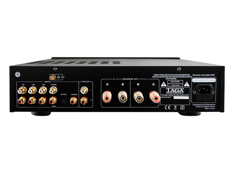 В ассортименте польской компании TAGA Harmony появился новый интегральный усилитель HTA-800 со встроенным ЦАПом и MM-фонокорректором. Аппарат построен на гибридной схеме с использованием двух радиоламп 6N3 в секции предусилителя и четырёх транзисторов Toshiba, установленных в выходном каскаде. По словам производителя, «такое решение позволило получить очень тёплое, линейное, естественное и, в то же самое время, динамичное звучание».