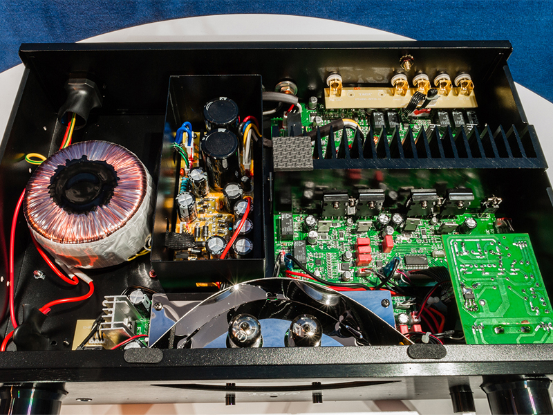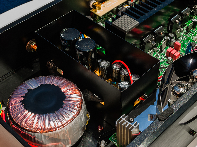 В источнике питания нового усилителя задействован мощный экранированный тороидальный трансформатор мощностью 200 Вт, гарантирующий стабильную непрерывную подачу тока и неискаженное воспроизведение музыки на любой громкости. Заявленная выходная мощность усилителя составляет 2х50 Вт при сопротивлении нагрузки 8 Ом или 2х60 Вт при 4 Ом в классе A/B. Кроме того, в устройстве применены высококлассные пленочные конденсаторы немецкого бренда WIMA и потенциометр ALPS, обладающий высокой надёжностью и минимизирующий перекрестные помехи между двумя каналами.