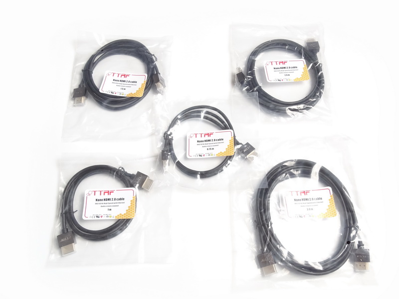 Серия кабелей Nano от компании TTAF завоевала многочисленные награды специализированных тестов и похвальные оценки пользователей за надежное соединение, стильный внешний вид и максимально компактные размеры. Она представлена межблочными кабелями RCA, переходниками mini jack 3.5 mm, оптическими кабелями, USB и HDMI кабелями, предлагающими высокое качество исполнения за вполне разумную стоимость. Благодаря уменьшенному профилю, высокой гибкости и минимальным разъемам HDMI-кабели TTAF Nano обеспечивают удобную коммутацию в условиях ограниченного пространства и хорошо подходят для скрытого монтажа или при неудобном расположении разъемов HDMI на AV-устройствах. Однако, в отличие от предыдущей версии HDMI-кабеля, длина которой не превышала двух метров из-за тонких проводников, не способных обеспечить достаточно высокую пропускную способность, новый кабель TTAF Nano HDMI 2.0 разработан для максимальной точной и стабильной передачи цифрового сигнала на большие расстояния, оставаясь при этом в миниатюрных размерах.