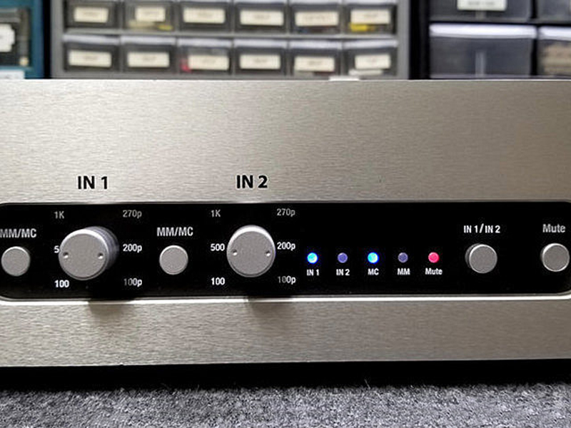 На переднюю панель устройства вынесены индикаторы и элементы управления для выбора типа подключаемого звукоснимателя, коэффициента усиления и нагрузки. Для современных высокоуровневых MM-головок звукоснимателей усиление составляет 42 дБ, входной импеданс – 47 кОм. Доступна коррекция ёмкостной нагрузки (100, 200 или 270 пФ). Коэффициент усиления для MC-головок со слабым выходным сигналом составляет 62 дБ с возможностью выбора сопротивления из 100, 500 или 1000 Ом. Переключение усиления и нагрузки осуществляется с использованием надёжных прецизионных реле малой мощности.